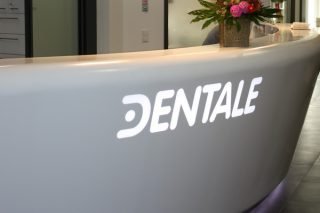 The 9 m long, curved, 3D shaped counter in the new DENTALE dental practice in Leipzig was a particularly exciting project for the Kiebitzberg® solid surface production team. The highlights: translucent backlighting of the LED logo and LED lighting in the counter base.