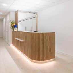 Keskustiski on valmistettu kestävästä massiivipintamateriaalista, ja siinä on paitsi riittävästi säilytystilaa myös erityishyllyjä potilasasiakirjoja varten ja postihuone laboratorion lähettämistä varten. Hienotunteisuuden säilyttämiseksi räätälöity lasijärjestelmä erottaa tiskin huomaamattomasti odotustilasta. Hoitohuoneet loistavat ystävällisessä valkoisessa värissä, ja niissä on hyvin harkittuja säilytys- ja järjestelymahdollisuuksia.