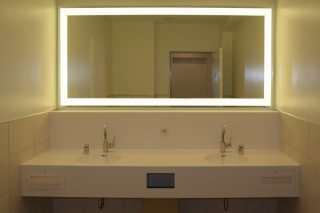 Mineralwerkstoff-Waschtische für öffentliche WCs in einem Planungsbüro. In der Schürze: 2 Papierspender & 1 Abwurf.
