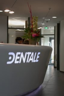 3D-verformter Tresen aus Mineralwerkstoff für ein Dental-Kompetenzzentrum in Leipzig mit eingefräster durchleuchtetem Logo und beleuchtetem Sockel